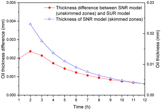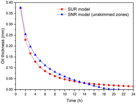 Comparison of oil thickness in the SUR model and the SNR model for 24 h.