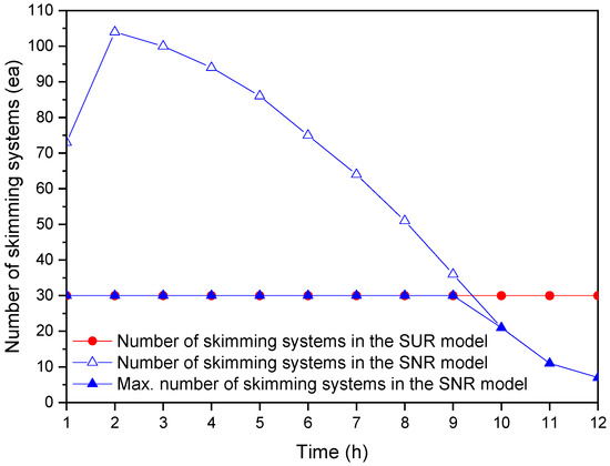 The second improvement allowed the SNR model to describe the space occupancy by skimming systems and prevent interaction between them. The deployable quantity of skimming systems could also be calculated over time. In other words, the number of skimming systems that can be deployed was limited by considering interference between skimming systems. Figure 4 shows the number of skimming systems used in the calculations and the maximum number of skimming systems, x(t), that can be deployable in the unskimmed oil slick of the SNR model. In both calculations, 30 skimming systems were used as an input value. This value was applied continuously in the calculation of the SUR model. The quantity of skimming systems was 30 until 9 h in the SNR model. However, this value decreased from 10 h in the SNR model as the maximum quantity of applicable skimming systems decreased. The SNR model could consider the space occupied by an individual skimming system and the interactions between multiple skimming systems. These improvements allowed the model to reflect actual conditions better.