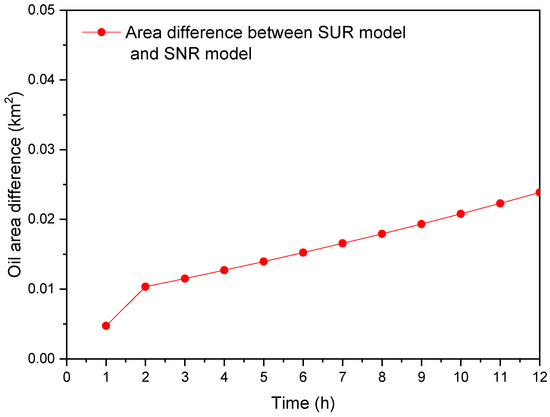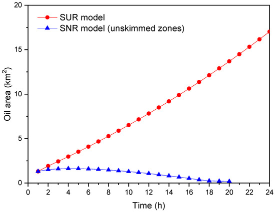 Figure 8 illustrates the slick areas of the SUR model and the unskimmed zones in the SNR model. In the SUR model, the slick area was calculated as a function of the initial spill volume, as in Equations (5) and (6), and it continuously increased without reflecting the volume changes by the mechanical recovery. In contrast, it was possible to reflect volume changes since the SNR model distinguished skimmed and unskimmed zones, as described above. As the volume continuously decreased and the unskimmed zone was changed to skimmed zones beginning at 2 h by oil recovery, the unskimmed area was smaller than the SUR model area. Furthermore, area decrease could be observed in the unskimmed area from 6 h to 20 h. It was because the area converted from unskimmed to skimmed was larger than the area increases of the unskimmed zone due to spreading during this time.