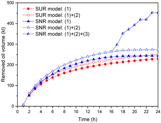 Comparison of the cumulative volume of removed oil between the SUR model and the SNR model: (1) volume of oil recovered by the skimming systems, (2) volume removed by weathering, (3) volume dissipated by thin slicks with an oil thickness of less than 0.6 μm.