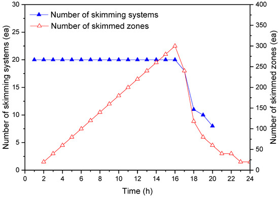Figure 7 shows the number of skimming systems used in the SNR model calculation and the quantity of skimmed zones over time. Twenty skimming systems began response 1 h after the accident. Hence, 20 skimmed zones and one unskimmed zone existed at 2 h. Likewise, 20 skimmed zones appeared again due to recovery activities at 2 h, leaving 40 skimmed zones and one unskimmed zone at 3 h. In this way, the zones recovered at time t were converted to skimmed zones at t + Δt and calculated separately from the unskimmed zone. Twenty skimmed zones were newly generated at 17 h, because 20 skimming systems were operational at 16 h. At the same time, however, 80 of the existing skimmed zones dissipated due to the reduction of the thickness (i.e., <0.6 μm). Therefore, the number of skimmed zones decreased by 60 at 17 h compared to that at 16 h. The thickness of the unskimmed zone was reduced to less than 0.6 μm at 21 h. As a result, no more skimmed zones were generated. Though the applied number of skimming systems was initially constant at 20, it then dropped below 20 at 17 h, as the number of deployable skimming systems decreased with the unskimmed area (Figure 8).