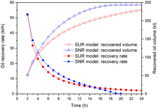 Comparison of mechanical oil recovery rate and cumulative recovery volume between the SUR model and the SNR model.