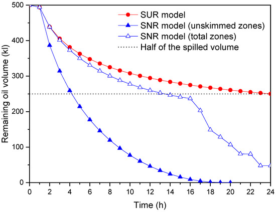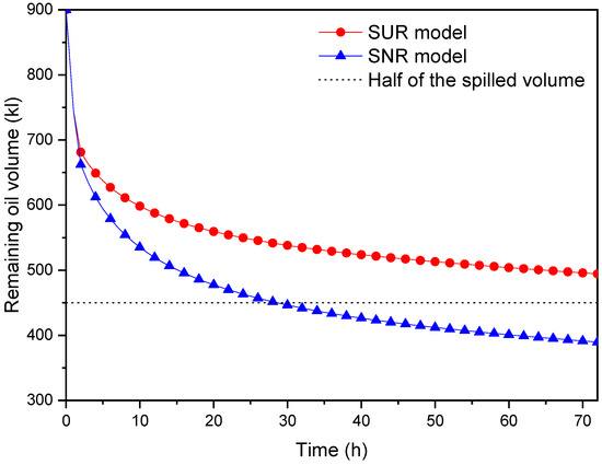 Comparison of the remaining oil volume of the SUR model and the SNR model (for 900 kl spill case).