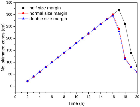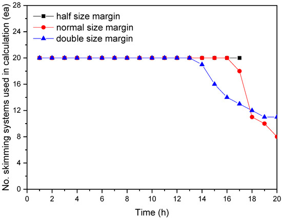 To identify the uncertainty of the SNR model, the effect of the parameter on the calculation results was analyzed. Mathematical modeling of the SNR model was developed to distinguish spatial differences in thickness between the skimmed and unskimmed zones. In addition, a spatial margin was added to prevent the collision of skimming systems, as shown in Equation (12). This marginal length might make some uncertainty on the number of skimming systems during the calculation. The uncertainty due to this marginal length was quantitatively analyzed for the 500 kl spill case study of Section 3.1. In the normal condition, the marginal length in the l1 direction, l1margin, is assumed to be half of l1s. The uncertainty of the calculation results was analyzed by varying the marginal length from the half to the double of the normal size condition. The number of skimming systems were compared in Figure 13. As the marginal length increased, the recovery time when a total of 20 skimming systems were operated decreased. Figure 14 shows the number of skimmed zones. The smaller the marginal length, the more the skimmed zones. The remaining oil volume of uncertainty study is summarized in Table 4.