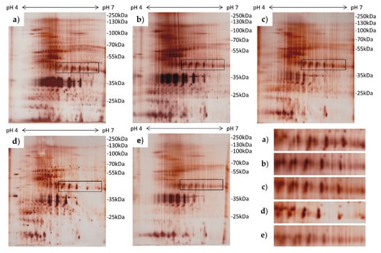 First, the amount of protein extracted from the samples was quantified using a modified Bradford protein assay (Cat. no.: 5000006 Bio-Rad, California, USA) []. For the first dimension of 2-DE, each immobilized pH gradient (IPG) strip (Cat no.: 1632034, Bio-Rad, California, USA) was rehydrated in 340 μL of rehydration buffer (containing 7 M urea, 2 M thiourea, 4% CHAPS, 0.2% dithiothreitol (DTT) [], and 3.4 μL of IPG buffer pH 3–10) (Cat. no.: 1631112, Bio-Rad, California, USA) for 16 h. During passive rehydration, 100 μg of protein from each sample was mixed with rehydration buffer. In terms of the cup-loading method, 100 μg of protein was mixed with rehydration buffer and then loaded onto the rehydrated strip (pH 4–7) by using the loading cup. IEF was performed using a Protean IEF cell (Cat. no.: 1654001, Bio-Rad, California, USA). Voltages were applied as follows: 1 h at 100 V, 2 h at 300 V, 2 h at 1000 V, 2 h at 4000 V, and 5 h at 8000 V. After IEF, the gel strip was equilibrated with equilibration buffer (50 mM Tris pH 8.8, 6 M urea, 30% glycerol, 2% sodium dodecyl sulfate, 1% DTT, and trace amounts of bromophenol blue) [] for 30 min. Later, the gel strip was transferred to the equilibration buffer containing 1% iodoacetamide (Cat no.: 1632109, Bio-Rad, California, USA) (instead of DTT(Cat no.: 1610611, Bio-Rad, California, USA)) and was incubated for 30 min. For the second dimension, the protein in the gel strips was separated using 10% polyacrylamide gel at 15 mA per gel until the bromophenol blue dye reached the end of the gel. Subsequently, the protein spots in the gel were visualized using silver staining. Finally, the stained gels were scanned and saved in TIFF format. Detection and analysis of the spots were performed using Melanie 7 (GeneBio, Genève, Switzerland) according to the user manual.