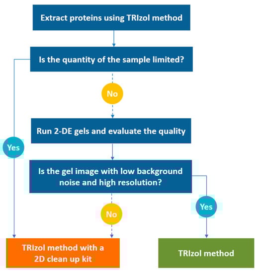 According to our findings, we recommend the use of a commercial clean-up kit after the TRIzol method for samples in which the TRIzol reagent alone fails to extract high-purity proteins. This kit could additionally eliminate some interfering substances that could not be effectively removed by the TRIzol reagent. We also suggest the direct extraction of proteins using the TRIzol method with a commercial clean-up kit when the quantity of samples is limited, and replication of extraction is not possible (Figure 5). This is because the protein yield and intensity and the number of protein spots in P. lima were not significantly affected after the extra treatment using the commercial clean-up kit. Although the aliquot TRIzol method was not feasible to produce high-quality 2-DE images for P. hoffmannianum in this study, this method might be useful for samples containing unexpectedly high amounts of interfering substances. The TRIzol would be able to manage these substances with a little negative effect on protein yield as well as the number and intensity of protein spots. However, TCA/acetone precipitation after the TRIzol method and repeated extraction with TRIzol are not recommended because additional TCA/acetone precipitation and TRIzol reagent adversely influenced the number and intensity of protein spots and the re-TRIzol method significantly reduced the protein yield.