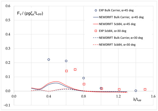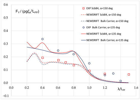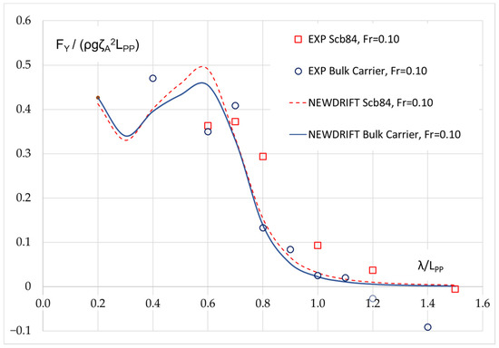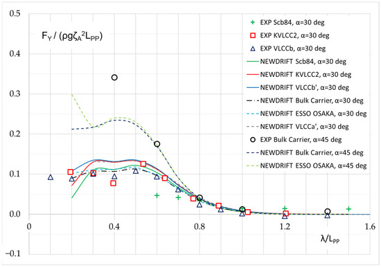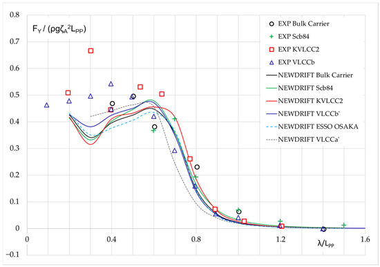 Figure 2 shows the calculated mean sway forces of the six ships in beam waves at zero speed as obtained both from experiments and from numerical predictions using NEWDRIFT. Overall, it is noted that the four sets of experimental results are close to each other, except for the results of KVLCC2, which show some oscillatory behavior in short waves. This might be due to the fact that the generated waves in this region were quite steep for KVLCC2. Note, also, that the model length of the KVLCC2 was the largest among the six test ships. The obtained numerical results show a similar trend for the mean sway force of the six ships. The maximum non-dimensional mean sway force is observed at λ/LPP ≈ 0.5–0.7. In short waves, the non-dimensional values all tend to approach a certain value between 0.4–0.5, which is expected, when considering that the limiting value of the mean sway force on a vertical wall is 0.5. The limiting value is a bit less than 0.5 because the hull is not vertical near the waterline, particularly at both ends. Nevertheless, some increased uncertainty appears in very short waves. This can be due to experimental and numerical issues. On the numerical side, in short waves, very small panels are needed and in addition, the phenomenon of irregular frequencies may trigger oscillations in the obtained results [19,39].
