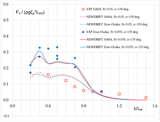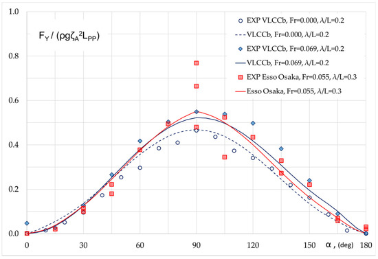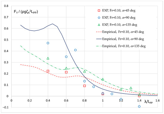 Examining both the experimental and numerical results in Figure 2, Figure 3, Figure 4, Figure 5, Figure 6, Figure 7, Figure 8 and Figure 9, we may detect a strong recurring functional pattern for the concerned mean sway force of the tested full ships at low speeds. This encourages us to attempt the development of an empirical formula to approximate the mean sway force in waves, as we did for the mean surge force or added resistance [40,41,42].