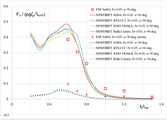 Figure 6 shows the experimental results for S-Cb84 at Fr = 0.05 in beam waves and stern oblique waves, together with the numerical results for the other tested ships for the same testing condition. For α = 90 deg, the numerical prediction is slightly higher than the experimental results. The maximum non-dimensional mean sway force is observed at λ/LPP ≈ 0.6. For α = 30 deg, the numerical prediction is lower than the experimental results, which may be related to insufficiency of the ensuing slender body theory when dealing with a ship sailing in stern oblique waves and at low frequency of encounter.