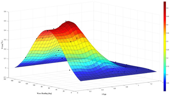 The red curve in Figure 11 shows the mean sway force exerting on the VLCCb’ approximated by Equation (7). Then, the shown dashed blue curve represents the difference between the total mean sway force calculated by NEWDRIFT and the approximate diffraction part of the side drift force, thus, the missing motion induced part. If the dashed blue curve can be properly represented by a formula, then an empirical formula can be formed.