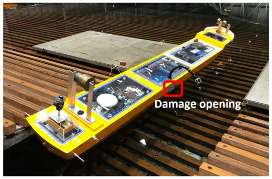 An aluminium frame was embedded on the starboard side around the midship. By attaching a lid to this aluminium frame, experiments in the intact state can be conducted (Figure 2a). By attaching a lid with a rectangular hole to the aluminium frame, experiments in a damaged state can also be conducted (Figure 2b). The damaged compartment is a combination of two continuous compartments, but without the vertical bulkhead, and its top is closed with the horizontal bulkhead. Figure 3 shows the floodable space inside the ship and the length and location of the damaged compartment. In the experiment, multiple decks are not realized because perfect water tightness cannot be expected, due to the presence of ventilation pipes, once serious flooding occurs. As the horizontal length of a damage opening is not uniquely determined by the current stochastic criteria of damage stability, IMO resolution MSC.194 (80) [16], it was determined based on the past deterministic criteria of damage stability. For the vertical height, the bottom of the opening was set to the allowable lowest limit from the viewpoint of the structural strength of the ship model.