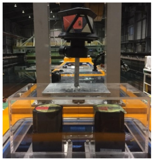Free-running model tests were conducted at the Marine Dynamics Basin of National Research Institute of Fisheries Engineering (NRIFE). The dimensions of the basin were 60 m length, 25 m width, and 3.2 m water depth. Inside the ship model, there were electric motors for driving two propellers and two rudders, an optical fibre gyroscope for measuring rotational motions of the ship, a microcomputer for managing the experimental and measurement systems, and batteries for supplying power to these devices. It is important to measure ship translational motions accurately for the free-running model tests; therefore, the ship position was measured using the ‘total station system’. Two stations were set up on land, which were equipped with a light-wave rangefinder and theodolite. Figure 4 shows the total station reflection prism placed on the bow and stern of the ship as tracking targets. With these, distance measurement by the laser light could be performed. The maximum error of the motion tracing system is ±1.6 mm. By combining the positioning data obtained using the ‘total station system’ and rotational motion data obtained by the onboard gyroscope, a ship motion with six degrees of freedom (DoFs) could be uniquely determined (Umeda et al., 2014) [17]. In the experiment, the ship motion was recorded with a video camera from outside the basin. The high-repeatability of the free-running test, using the same measurement system, was reported by Matsuda et al. (2016) [18].