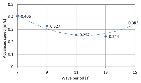 Regarding the wave height in long-crested irregular waves, a significant wave height of 5.5 m was used, which is equivalent to Beaufort scale 8. As the possible range of the mean wave period is quite wide, the wave period providing the largest speed drop in regular head waves was investigated first. Figure 5 shows the effect of wave period on the ship’s forward speed in regular head waves. Drawing a second-order approximation curve, 11.6 s was found to be the wave period showing the largest speed drop on the real ship scale. The obtained period was used as the peak period of the long-crested irregular waves, which can be transformed into the mean period of 8.95 s using their relationship, e.g., ITTC (2002) [21]. Then, the minimum propeller revolution number was determined, which satisfied six knots on a real scale. As a result, the propeller revolution marginally satisfying the propulsion requirement for SRtP was determined as 706 rpm in the model scale. Therefore, all experiments in long- and short-crested irregular waves, in the following sections, were conducted with a significant wave height of 0.067 m and a mean wave period of 0.988 s in the model scale, which correspond to 5.5 m and 8.95 s in the real scale, respectively.