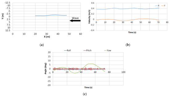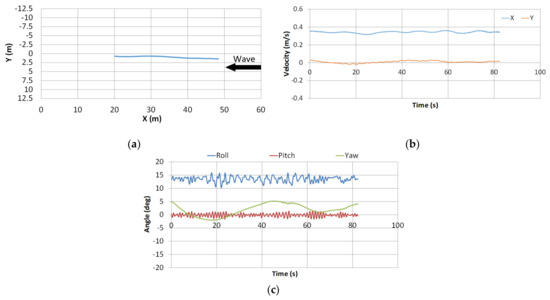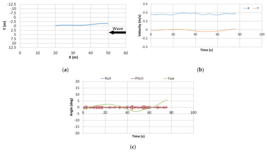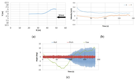 Experimental result in damaged condition in regular waves: (a) ship trajectory; (b) ship velocity in X and Y directions; (c) time history of roll, pitch, and yaw.