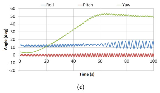 Figure 7 and Figure 8 show the results in regular head waves for the intact and damaged states. In the intact condition, it was possible to proceed against the incoming waves to maintain the desired course. On the other hand, in the damaged condition, it was difficult to proceed against the waves and to maintain the desired course, and thus, the ship drifted laterally. One reason for the different behaviours is that a turning moment was induced because of the asymmetric underwater hull caused by the steady heel in the damaged condition. The result of ship rotational motions indicated that a roll motion was gradually excited, and finally, reached the amplitude of 10° in the intact condition and 5° in the damaged condition. Here, the encounter period was about a half of the natural roll period, so it is a so-called ‘parametric roll’ phenomenon, c.f. Paulling (2011) [22]. The reason why the amplitude in the damaged condition was smaller than that in the intact condition is that the natural roll period could be shorter and the roll damping could be larger when floodwater exists inside the ship.