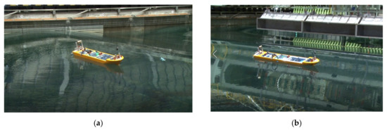Using the propeller speed determined in the previous section, free-running model tests were conducted in regular head waves, long-crested irregular head waves, and short-crested irregular head waves. The tests were conducted in both intact and damaged states, and the measured results of a 6-DoFs ship motion were compared to confirm the effects of floodwater on the manoeuvring performance in the damaged/flooded condition. Table 2 shows parameters related to the dynamic motion of the ship in the intact state. In the damage state, 13.6 degrees of steady heel angle resulted from the asymmetricity of the damaged compartment, as shown in Figure 3. Note that the metacentric height indicates the value for the intact and upright condition. A snapshot of the free-running model test is shown in Figure 6.