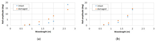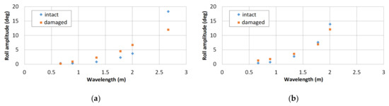 Result of the stability test in regular beam waves, where damage opening is to leeward: (a) wave steepness of 0.025; (b) wave steepness of 0.05.