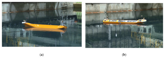 It can be easily imagined that a ship can lose her propulsion function in serious damage and flooding events. Therefore, a model experiment in a freely drifting condition in waves was conducted. In a drifting condition without any propulsion, a synchronous roll in beam waves, where the wave period equals the ship’s natural roll period, is considered the most dangerous situation, except for the afore-mentioned parametric roll. Therefore, a free drifting experiment in regular beam waves was performed at several wave periods. Here the wave encounter angle was ±90°, considering the left–right asymmetric damage. The wave conditions in the experiment are shown in Table 3. In the case of the wave steepness of 1/40, the wave period corresponding to the natural roll period was included, but not in the case of 1/20 wave steepness, because of the limitation of the wave maker. However, this wave period corresponds to a wavelength of more than 900 m in the actual ship scale, and hence, the occurrence probability of such a wave is almost zero. For comparison, the model experiment was conducted for both the intact and damaged conditions, under the same wave conditions (Figure 13).