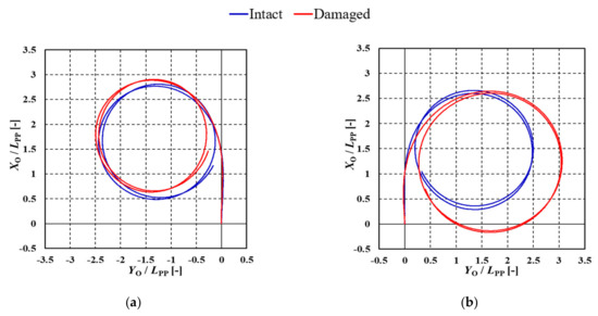Measured trajectory in intact and damaged conditions: (a) turn to port with δ = −35°; (b) turn to starboard with δ = 35°.
