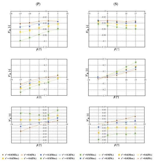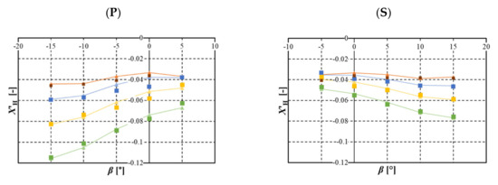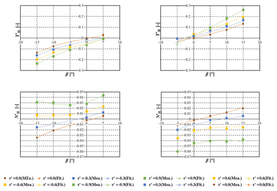 The CMT was performed for both directions of the turn because of the existence of steady heel. The drift angle, β, of −5 to 15° and non-dimensional yaw rate r’ = Ur/Lpp of −0.3 to 0.9 were selected for turning to the port and those of 5 to −15° and 0.3 to −0.9 were selected for turning to the starboard. The measured hull manoeuvring forces in the intact and damaged states are shown in Figure 21 and Figure 22, respectively. For both states, a significant difference appears in the manoeuvring forces between the turning directions, because of the existence of heel. Focusing on the difference between the intact and damage states, a prominent difference can be found in the surge force in both directions of turn and the sway force in port turning. A slight difference is found in the sway force and the yaw moment in starboard turning, particularly in the combination of large drift angle and large yaw rate.