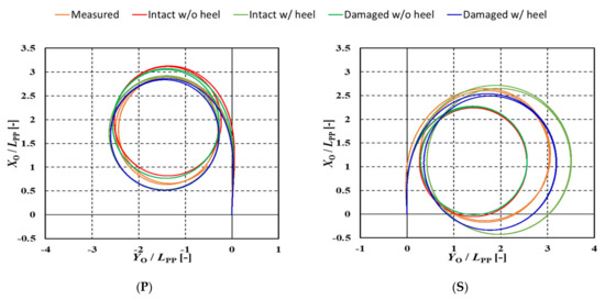 The trajectories of the port turn and the starboard turn appeared almost symmetrical in the intact condition, and largely different in the damaged condition. As the ship inclined outward due to the action of centrifugal force during turning, it leaned to the left side in the turn to the starboard and to the right side in the turn to the port. However, the ship remained heeled to the starboard side even while turning to the starboard in the damaged condition, so the height of the action point of the lateral force differed between the intact and damaged conditions. As a result, there was a significant left–right difference in the turning trajectory. In addition, there was a large difference in speed reduction between the port and starboard turning. These results clearly indicate that the steady heel due to the damage/floodwater has a significant effect on the ship-turning manoeuvrability, and that the turning circle enlarges when turning to the damaged side, compared to the intact condition.