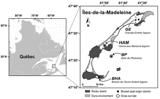 In Canada, blue mussel (Mytilus edulis, L. 1758) farming is exclusively supplied by wild spat using ropes as artificial collectors. For more than 25 years, mussel culture in the Îles-de-la-Madeleine has relied on the collection of wild juveniles in a small lagoon, the Bassin du Havre-Aubert (BHA). This area is used to supply spat because this local stock has better performance in terms of survival and growth compared to neighboring sites (<65 km between the most distant mussel populations) [16]. Indeed, several studies have demonstrated that this high performance is related to specific metabolic and genetic features that provide better resistance to stressful conditions and lower vulnerability to summer mortality episodes [17,18,19,20,21,22]. Despite this advantage, BHA is small (3 km2) and shallow (2–3 m), and has a large interannual variability in spat supply; all these restrict the development of local mussel farming [23]. Because of this, alternative supply scenarios need to be identified by reassessing the commercial potential of all stocks of mussel spat in the Îles-de-la-Madeleine, particularly for offshore culture.
