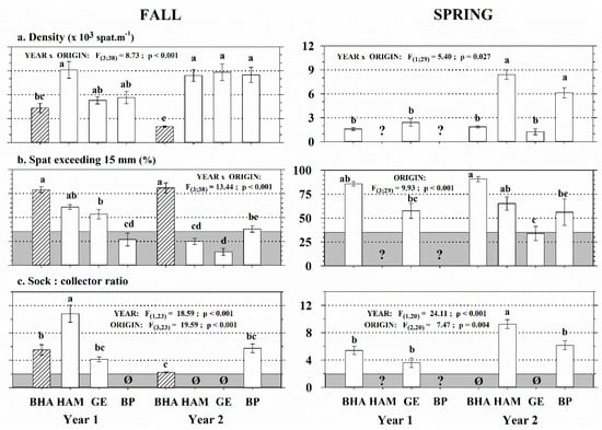 Mussel spat stock performance (origin × year × season) from the Îles-de-la-Madeleine, with spat density (a), proportion of spat > 15 mm (b) and sock:collector ratio (c). Data are Mean ± SE; n = 6 collectors. BHA, HAM, GE, and BP = spat origin. Striped bars = control stocks. Year 1 and Year 2 = spawning year (2014, 2015). Horizontal gray area (b and c) = industrial criteria to grow-out a mussel stock (threshold of 35% of spat > 15 mm and sock:collector ratio > 2:1). ? = collectors lost during winter. Ø = unsleeved stocks (industrial criteria not met). For each season of spat recovery, significant results of two-way ANOVAs are presented and letters indicate significant differences (p < 0.05) among stocks. BHA, Bassin du Havre-Aubert; HAM, Havre-aux-Maisons; GE, Grande-Entrée; BP, Baie de Plaisance.
