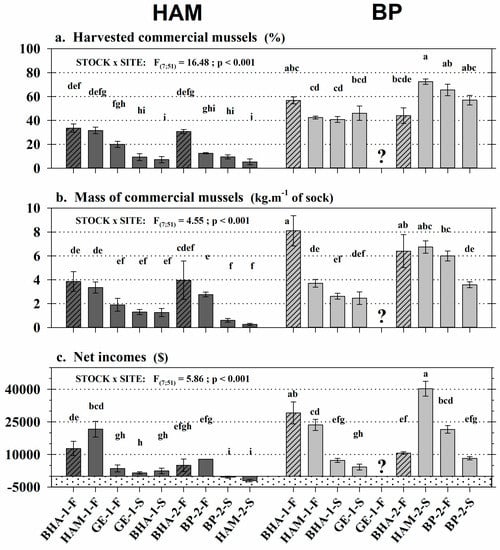 Commercial performance of the nine spat stocks sleeved and harvested after a two year production cycle at the HAM (dark gray) and BP (light gray) grow-out sites: (a) Proportion and (b) mass of commercial mussels (>50 mm) as well as the (c) net incomes associated. Data are Mean ± SE; n = 2–5 mussel socks. BHA, HAM, GE, and BP = spat origin. Striped bars = control stocks. 1 and 2 = spawning years (2014, 2015). F and S = fall and spring spat collector recovery. Stippled area = negative net incomes. ? = lost stocks. Significant results of two-way ANOVAs are presented and letters indicate significant differences (p < 0.05) among stock-site combinations.
