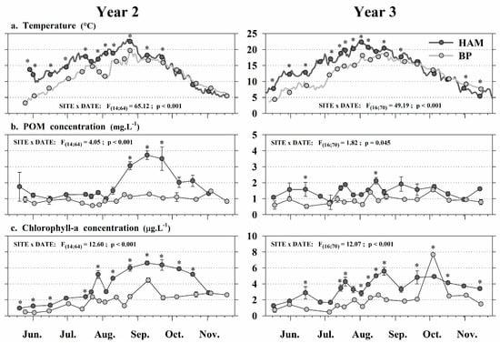 Monitoring environmental conditions in the HAM (dark gray) and BP (light gray) grow-out sites in Year 2 and Year 3 (2015, 2016): (a) temperature; (b) particulate organic matter; (c) chlorophyll-a. Data are Mean ± SE; n = 3 samples. Significant results of two-way ANOVAs are presented. * = significant difference (p < 0.05) between grow-out sites.