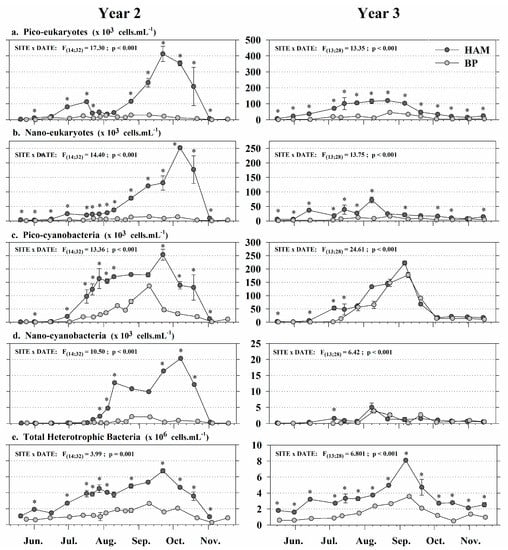 The lagoon (HAM) and offshore (BP) sites showed strong differences in their environmental conditions from May to November for both years (Table 2, Figure 4 and Figure 5). The SIMPER analysis carried out on data from each year showed that all parameters contributed almost equally to the difference between sites (Table 3), with contributions to the dissimilarity ranging between 10% and 14%. However, total heterotrophic bacteria and POM concentrations had slightly higher influences on the differentiation observed each year. According to the average squared Euclidean distances calculated, the dissimilarity between sites was higher in Year 2 than in Year 3, with respective values of δ = 20.44 and δ = 18.71. Two-way ANOVAs performed on each of the eight environmental parameters showed site × date interactions, but values were generally higher in HAM (Figure 4 and Figure 5). In both years, water temperatures were higher in HAM from late May to September, reaching 15 °C approximately one month earlier. The maximal temperature measured in HAM exceeded 23 °C but remained below 20 °C in BP (Figure 4a). Despite a global similarity between POM concentrations observed in both sites each year (1–2 mg L−1), we observed a major peak from late August to late September in 2015 (Year 2), with values three times higher in HAM than in BP (Figure 4b). The period of maximum chlorophyll-a concentration (>2 µg L−1) ranged from mid-July to mid-October in both sites (Figure 4c), but values were 2–3 times higher in HAM than in BP. At both sites, planktonic communities were dominated by pico-eukaryotes (Figure 5a) and pico-cyanobacteria (Figure 5c). Overall, bacteria and eukaryotes (pico and nano) concentrations tended to be higher in the shallow lagoon than in the offshore site, with average abundances in HAM being 2–3 times (bacteria) and 4–10 times (eukaryotes) higher than those measured in BP. This spatial pattern was not observed for cyanobacteria in Year 3, where abundances (pico and nano) showed similar patterns at both sites. These trends were associated with interannual variations of planktonic concentrations in HAM. The overall average abundances in HAM decreased by two (pico-plankton) and three (nano-plankton) times between Year 2 and Year 3, while they tended to follow a similar pattern for all planktonic groups in BP.