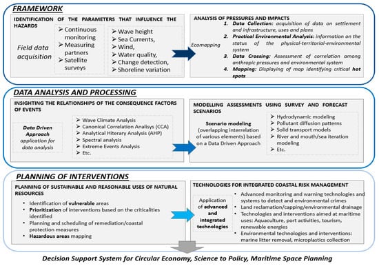 The first point focuses on the need for a management strategy that properly embeds socioeconomic and environmental aspects. This concept is also highlighted in the ICZM protocol and it is one of the pivotal principles of the Maritime Spatial planning directive (2014/89/EU) []. The consideration of coastal risks is strictly related to climate change and the consequences it can have on coastal systems. Marine floods and more intense storm surges are examples of this. The second point comes from the awareness underlined in the numerous academic studies, which can be summarized as follows: