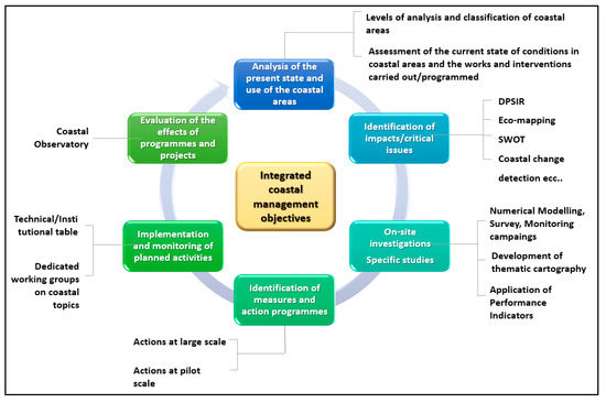 Considering what reported in the previous sections, a methodology proposal is described in the following paragraphs. The procedure takes strictly into account the scheme shown in Figure 1 in which the structure was defined considering the conceptual outline of coastal management approach (Figure 2).