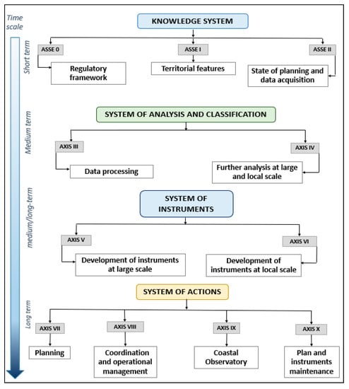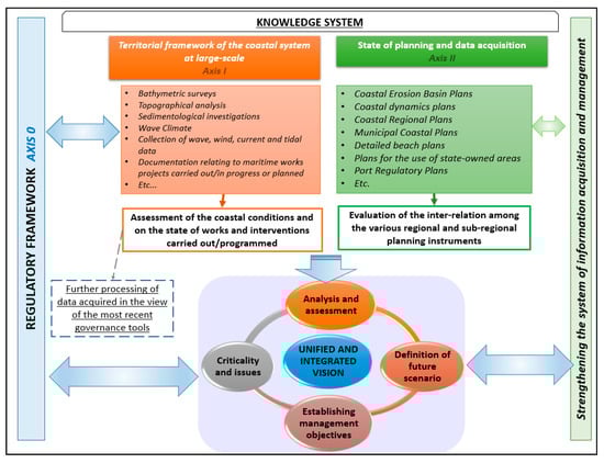 The proposed methodology provides for four fundamental systems (Figure 3), which are the pillars on which the articulated logical path based on the implementation of integrated coast management is built. The fundamental systems are the following: system of knowledge, system of analysis and classification, system of instruments and system of actions. Each system is in turn divided into specific axes of activity.
