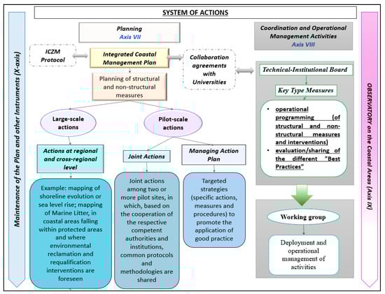 As shown in Figure 3, the system of actions includes the planning activity (Axis VII), the coordination and operational management activity (Axis VIII), the development of the coastal observatory for the control and monitoring activities (Axis IX) and the Maintenance activities of the plan and the other Instruments (Axis X). Figure 7 shows a schematic view of the contents of the action system.