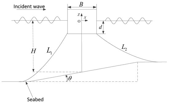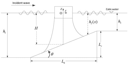 Compared with that of deep water offshore structures, design and construction of floating structures in coastal environments face unique challenges and the dynamics of these structures could be more complicated because of the seabed effects. Previous researches suggest that shallow waters can excite larger responses of offshore structures under hydrodynamic loading because of the flat seabed effects [,,]. As numerical approaches for flat seabeds are not directly applicable to sloping seabed profiles, refs. [,] developed second-body models to account for the sloping seabed effect within the boundary element model frame and found that a sloping seabed significantly influences the cross coupling hydrodynamic coefficients. Refs. [,] developed multi-domain approaches that divide the fluid domain into an interior domain of variable water depth and an exterior domain of constant depth. An extra term accounting for the sloping-bottom effects is introduced to correct the incident wave potential so that the sloping seabed condition is satisfied. They found that the sloping seabed significantly affects the body motion response amplitude operator (RAO). Ref. [] coupled a Rankine source model to the Boussinesq equation, which supplies all relevant information concerning the fluid domain. They reported that the peak frequency of the exciting forces and motion responses are shifted ahead due to the sloping seabed effects. Refs. [,] introduced a reflection velocity potential to account for the sloping seabed effect. Numerical results demonstrated that the sloping seabed alters the symmetrical profile of the fluid domain and the coupled effects between different motion modes become important. However, the mooring lines are not considered in these numerical models.