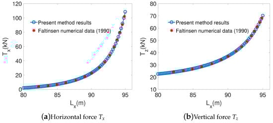 The stiffness characteristics of catenary mooring lines are investigated preliminarily by the static offset tests. For a mooring line with a length of L = 100 m and a unit weight of W = 828 N/m, moored in water depth h = 25 m, Figure 4 shows the comparison of this mooring line stiffness curves with respect to horizontal force and vertical force between the proposed numerical method and [] (pp. 258–263). Results from the proposed method show excellent agreement with those of []. It is noticed that both the horizontal force and vertical force demonstrate nonlinear characteristics as the mooring line horizontal distance increases and this phenomenon is also called nonlinear “hardening“ behaviour by [].