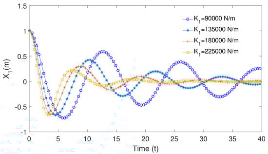 where denotes the body offset and is corresponding to the body displacement in Equation (1). Figure 6 shows the surge decay test for the cylinder with mooring line stiffness N/m, N/m, N/m and N/m, respectively. It is noticed that the decay period and motion amplitude decrease as stiffness increases. The coupled system free decay period can be analytically evaluated by the following equation of [] (pp. 275–278):