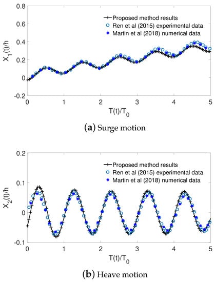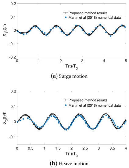 Comparison of time records of surge motion (a) and heave motion (b) between proposed method results and [] numerical data with mooring effect included.