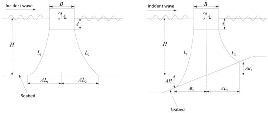 A rectangular cylinder with breadth B = 20 m and draft d = 10 m is selected as the floating body. Such a body size is typical of floating bodies in ocean and offshore engineering. An average water depth of H = 200 m is considered for the first numerical case. Two types of seabed and mooring line configurations are used in the numerical simulations. The first type is a flat seabed with two identical mooring lines, and the second one is a sloping seabed with two different mooring line arrangement. Figure 9 shows the profiles of symmetrical and asymmetrical seabeds with mooring lines. For the flat seabed condition, the left-side mooring line length and anchor horizontal distance equal the right-side values and . The average water depths H for the sloping seabeds are same as the flat ones for direct comparisons. Each mooring line has a weight of W = 5 kN/m in water and two mooring lines are used on each side in the present study unless otherwise stated.