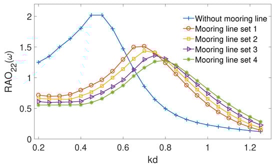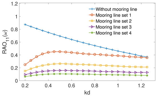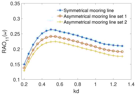 Figure 12 shows a comparison of the surge motion of the floating body between symmetrical mooring line condition, asymmetrical mooring line set 1 and set 2. It is noticed that the surge motion reduces appreciably as the asymmetry level increases across the whole wave frequency range. Compared with the symmetrical case, the left-side length of asymmetrical mooring line set 2 increases by , but it reduces the by approximately . If less mooring line length is allowed to lie on the seabed, effects due to the mooring line asymmetry are expected to be more significant. It should be noticed that the difference between the left-and right-side mooring lines is in a reasonable range, otherwise the mooring line set can not keep the floating body at a static equilibrium position. The heave motion is marginally affected by the asymmetrical mooring line setup and therefore the data are not presented here.
