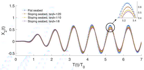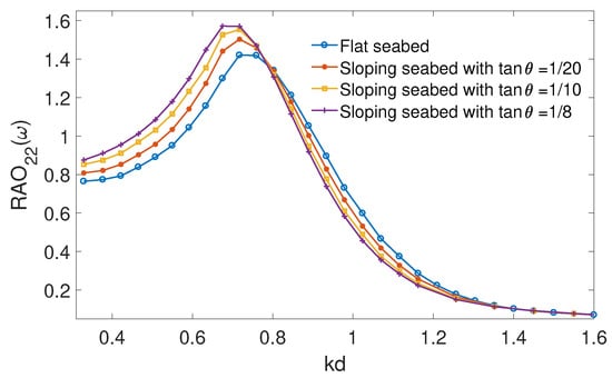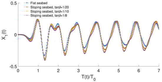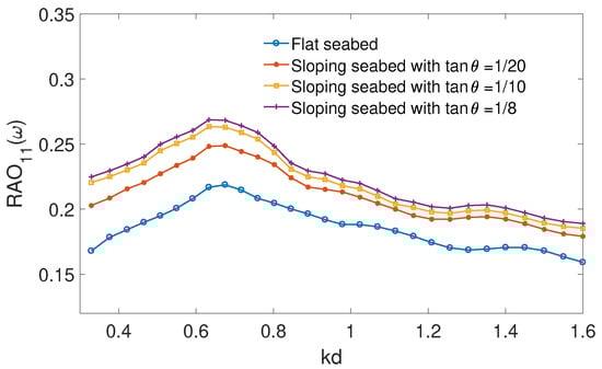 The left-side mooring line weight has a weight of W = 5 kN/m in water for the sloping seabed case, and the floating body is at a static equilibrium. A preliminary iterative procedure is developed to calculate the right-side mooring line weight per meter to reach static equilibrium. Figure 15 shows a comparison of the surge motion of the floating body between a flat seabed and a sloping seabed with , and , respectively. It is noticed that the surge motion is smaller for the flat seabed than the sloping seabed conditions and increases as the sloping seabed angle increases across the frequency range.