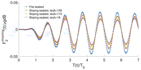 Comparison of time record of mooring line force for wave frequency between flat seabed, sloping seabed with , and , respectively.