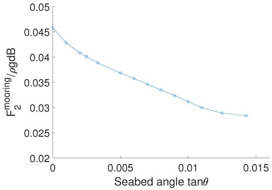To demonstrate the slope seabed inclination effects for the mooring line force. Numerical simulations are performed for this floating body positioned above a sloping seabed with various inclinations. Figure 21 shows a comparison of the mooring line force amplitude for different slope seabed angle for the floating body experiencing an incident wave with frequency . It is noticed that the mooring line force reduces as seabed angle increases. In the present study, the mooring line and floating body are coupled into an integrated model. The mooring line force is excited mainly due to the floating body motion which is caused by the incident wave. The mooring line force amplitude conforms with the floating body motion amplitude.