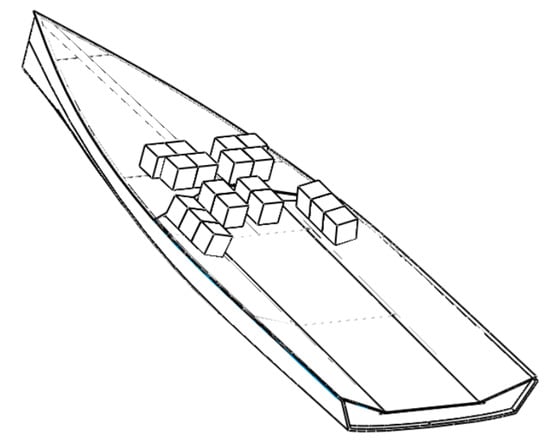 Mass and inertia values are accounting for the two sailors that were on board during the regatta and for the full rig of the boat. In order to reproduce the real mass distribution during the experiment, the rig and the sailors were replaced with 18 small blocks of 9.722 kg. A schematic representation of the hull and its mass distribution is shown in Figure 2.