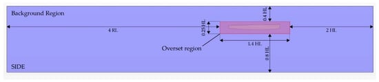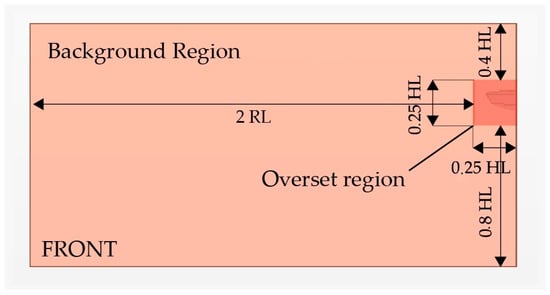 At this point, it is clear that a parametric approach represents the best choice in order to save computational time, where domain length, mesh refinement, damping zone, and other important parameters are functions of the wavelength and thus of the speed of test. In this regard, a reference length (RL), which is the longer length between hull-length and wavelength, was chosen, and the domain’s dimensions are a function of the reference length, as shown hereafter and in Figures 5 and 6: