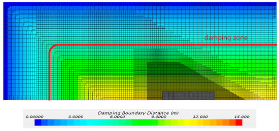 A simple approach is used to solve this issue in real and in CFD tanks: A large damping zone is introduced at the boundaries of the tank in order to absorb most of the energy of the incoming waves before they are reflected, hence leaving the domain undisturbed from reflection. In numerical simulations, the length and the intensity of this damping zone must be related with the domain dimensions, wavelength, and wave height. For our case, a damping zone of two times wavelength is enough to prevent wave reflection at boundaries [21,22,23].