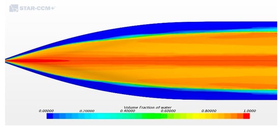 When implementing a dual phase simulation, due to the numerical interpolation method in the VOF model, it is possible that a fraction of air gets caught and remains trapped under the hull, creating a mixture of phases [30], as shown in Figure 12. Air usually undergoes the hull at the bow and travels down to the stern, establishing a steady flux. As a consequence, the wall friction drag is underestimated. It is worth remarking that the contribution of the form drag to the overall drag is not affected by numerical ventilation.
