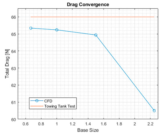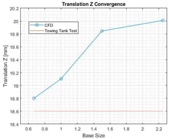 Table 2 presents the different base sizes used, the associated number of cells, the relative errors, and the corresponding CPU time of the simulation. The physical quantities that were monitored in this convergence study are the total drag experienced by the hull, the translation along the z axis, and the trim angle. The obtained total drag and vertical translations are shown in Figure 14 and Figure 15, respectively. The benchmark used to build the error metrics is the dataset from the EFD. The method used for the analysis is the Richardson extrapolation, with the correction based on the total number of cells [39]. In this regard, the base size had to have a constant increment; in order to keep the cell count low, we decided for 1.5 as the multiplier for the base size.