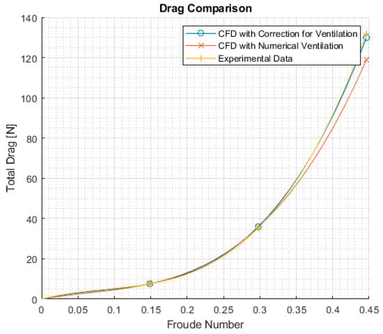 As clearly shown in Figure 16, experimental results are better approximated when the numerical ventilation correction is applied. This method increased the total advancing drag of the hull and guaranteed a reduction of the relative error with respect to the experimental data; the error of the numerical model after correction was between 0.61% and 1.94% for drag, below the 2% threshold. The difference after ventilation correction was noticeable only for 3 m/s because for the other two speeds tested the numerical ventilation under the hull was practically absent. Moreover, it is important notice that the ventilation correction did not influence the trim angle at all, leaving it unchanged.