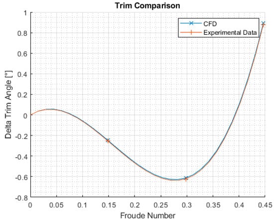 Results in Table 3 are obtained from the postprocessing of CFD simulations and are presented in Figure 16 and Figure 17. The main objective of this work was to validate the numerical model through comparison with experimental data. Furthermore, it is interesting to compare results with and without correction for numerical ventilation in order to evaluate the benefit of the numerical strategy herein proposed. Values of ΔTrim angle were positive when the bow was lifted up.